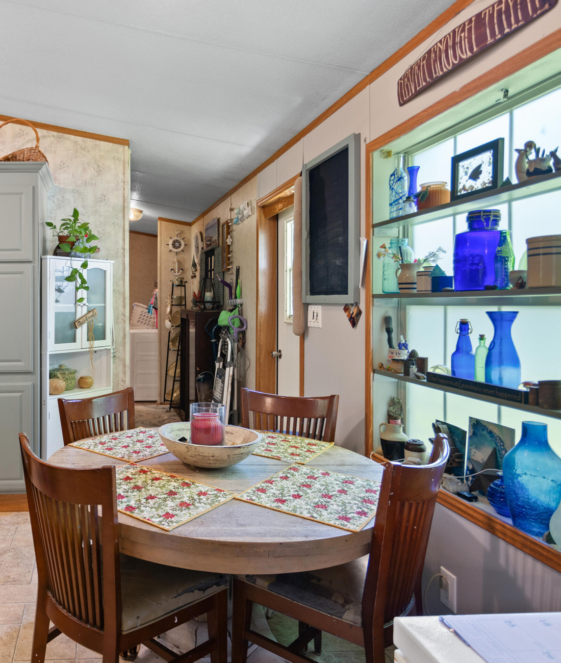 Next to the kitchen is a round table. It’s a great place for breakfast or board games. Pretty placemats and a homemade bowl keep it inviting. Behind the table, a built-in shelf glows. It shows off blue glass bottles and little treasures. The lights make everything sparkle. Even a small eating area can feel special!
