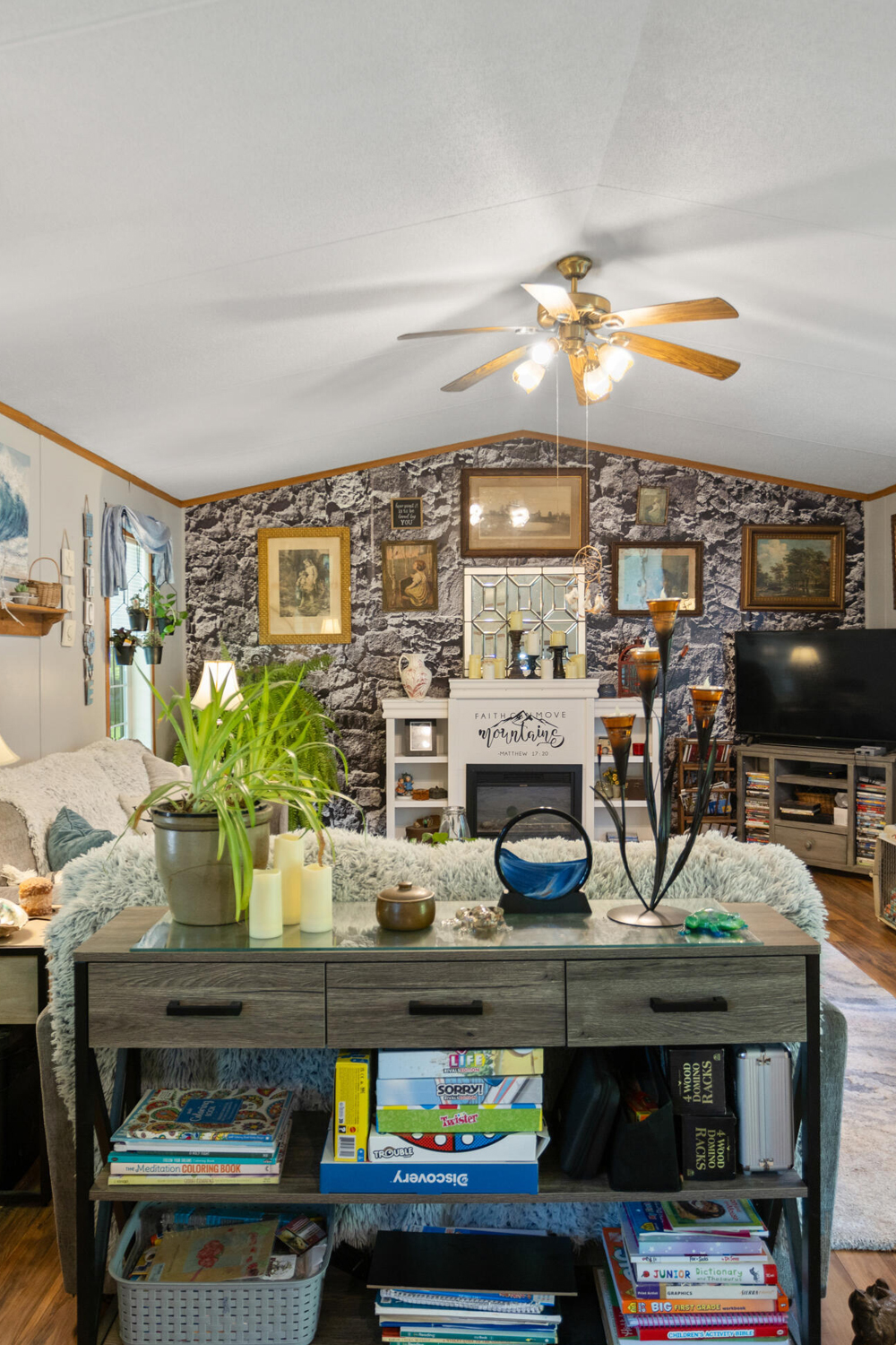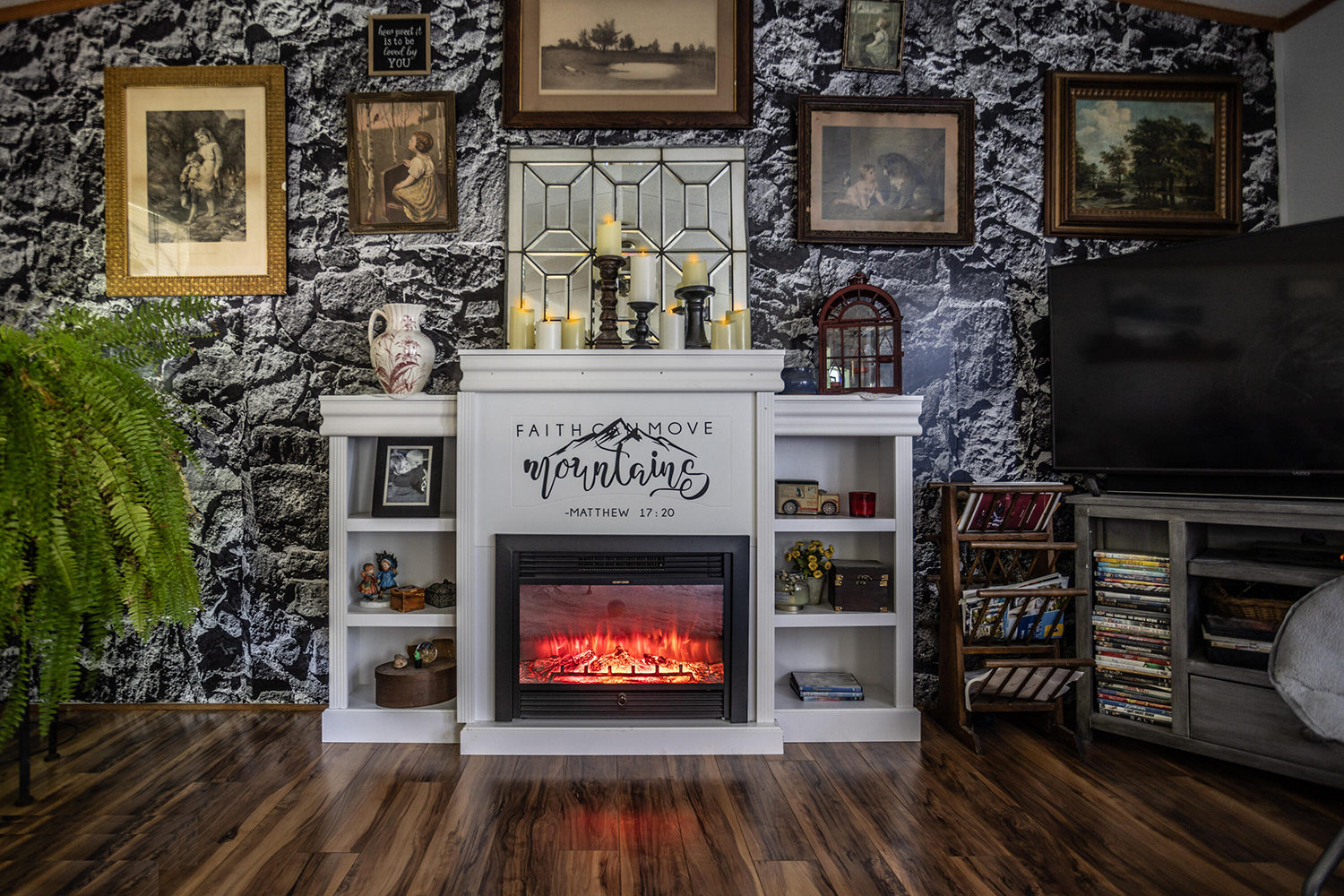 The back wall looks like real stone. It’s bold and eye-catching. Old pictures and frames hang over a white electric fireplace. The TV sits off to the side, ready for movie night. Books, games, and plants fill the corners. This is a room where people hang out and feel at home.