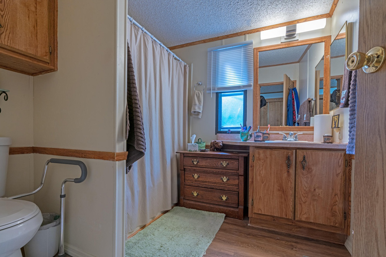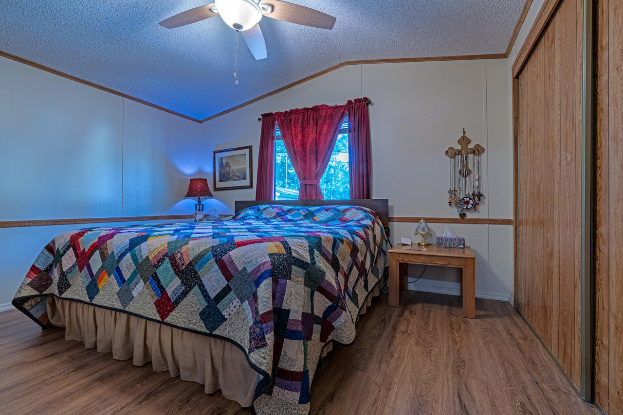Step into the bedroom and it’s all about rest and relaxation. The bed is topped with a colorful, handmade quilt that brings a touch of nostalgia and plenty of warmth. Rich wood tones show up in the nightstand and closet doors, tying the room together with the rest of the home’s style.