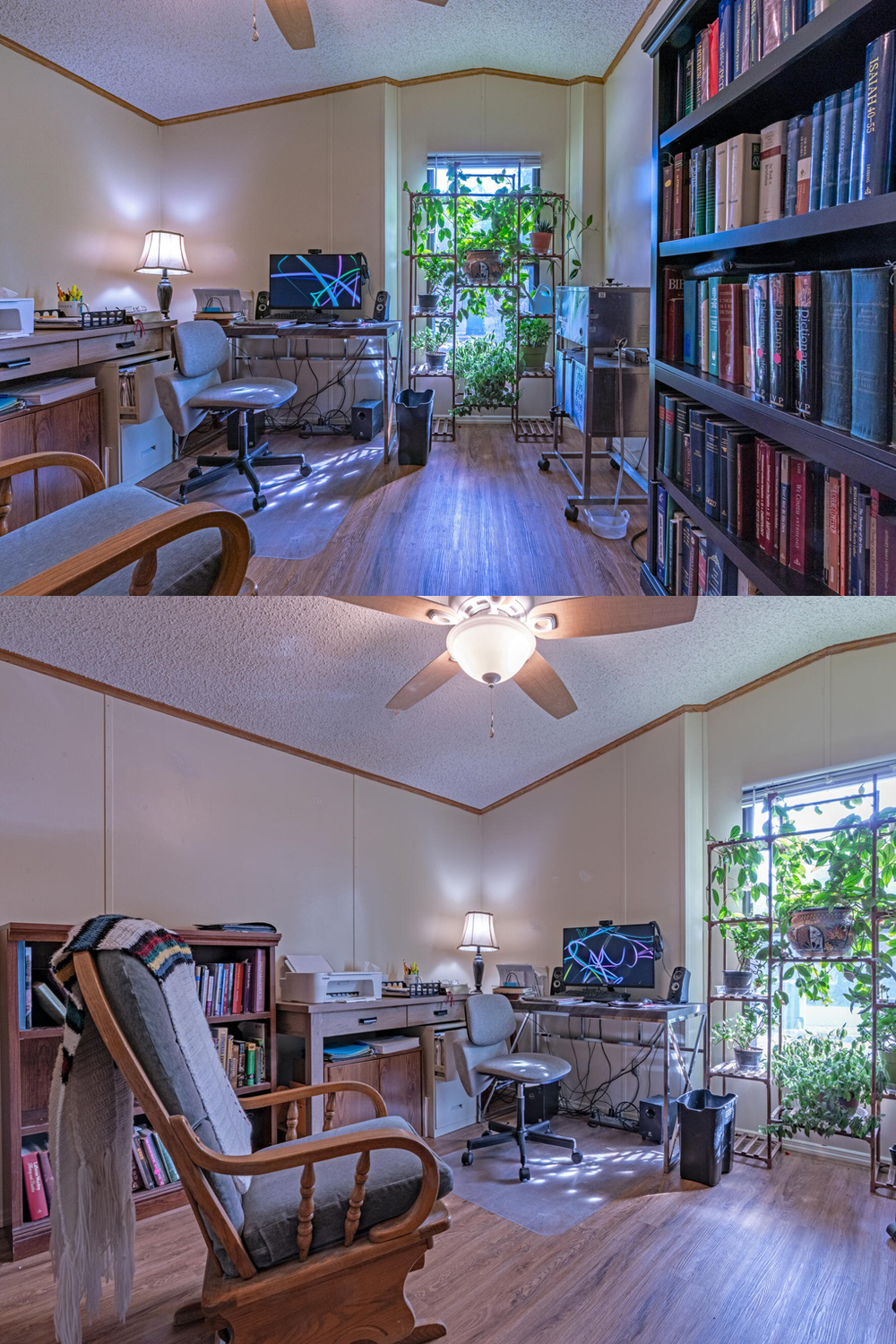 This home doesn’t just settle for the basics. The office space here is bright, organized, and bursting with personality. A large bookshelf lines one wall, filled with books and resources that show a love of learning and curiosity.