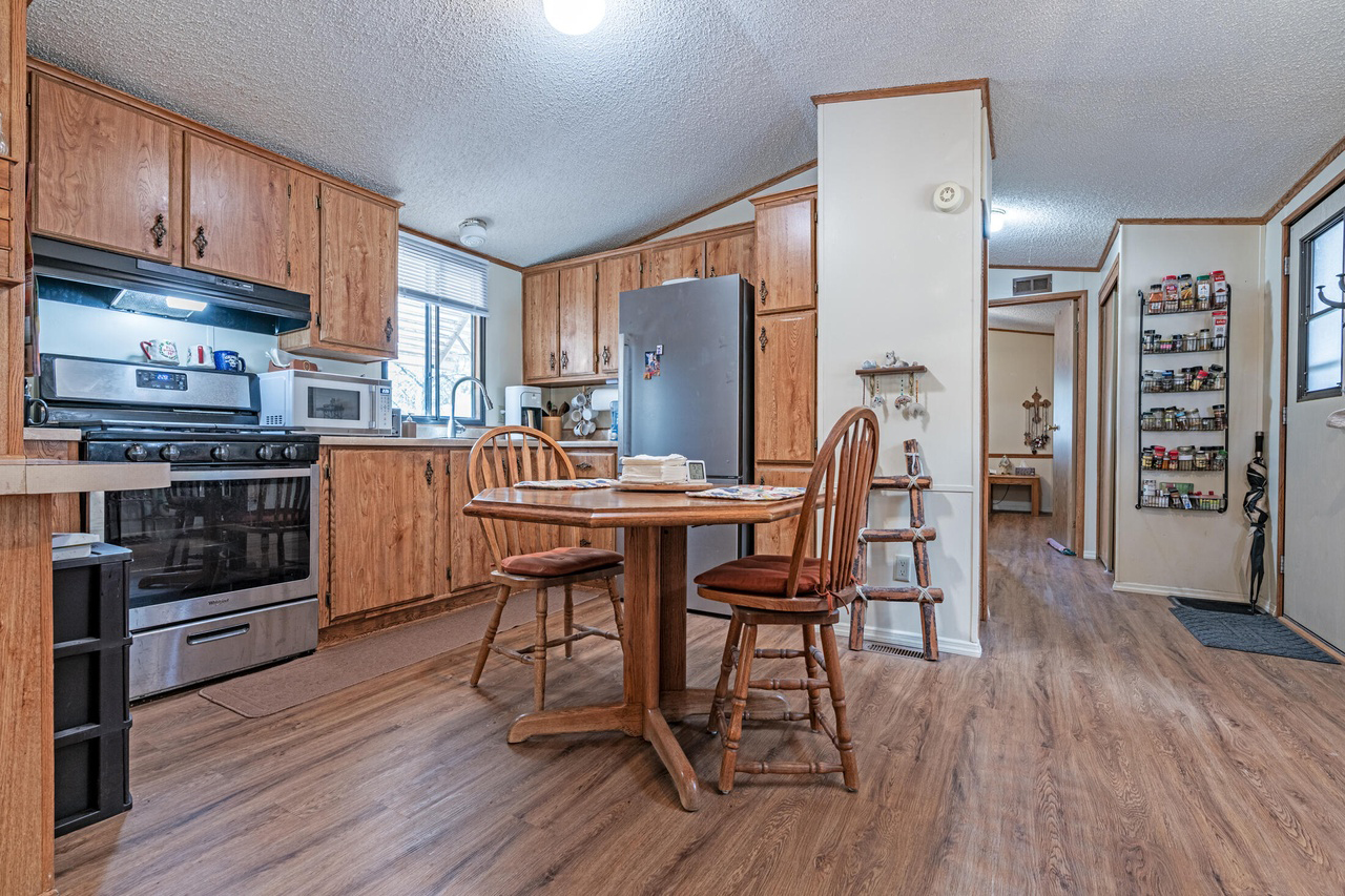 Step over to the kitchen, and you’ll find a space that feels both old-school and updated for daily life. The real wood cabinets, with their rich grain and classic hardware, bring warmth to the heart of the home. Countertops wrap around in a U-shape, offering plenty of room for prepping meals or setting out snacks for guests.