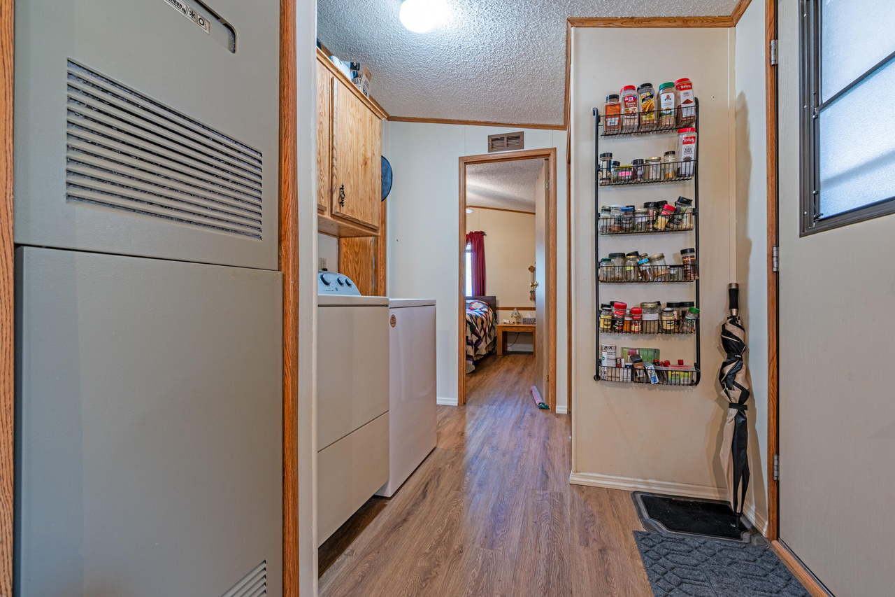 The same wood cabinetry shows up here, creating a seamless look from one room to the next. A hallway rack keeps cleaning supplies and extra pantry items within easy reach. It’s practical, but also has that same warm, lived-in feeling.