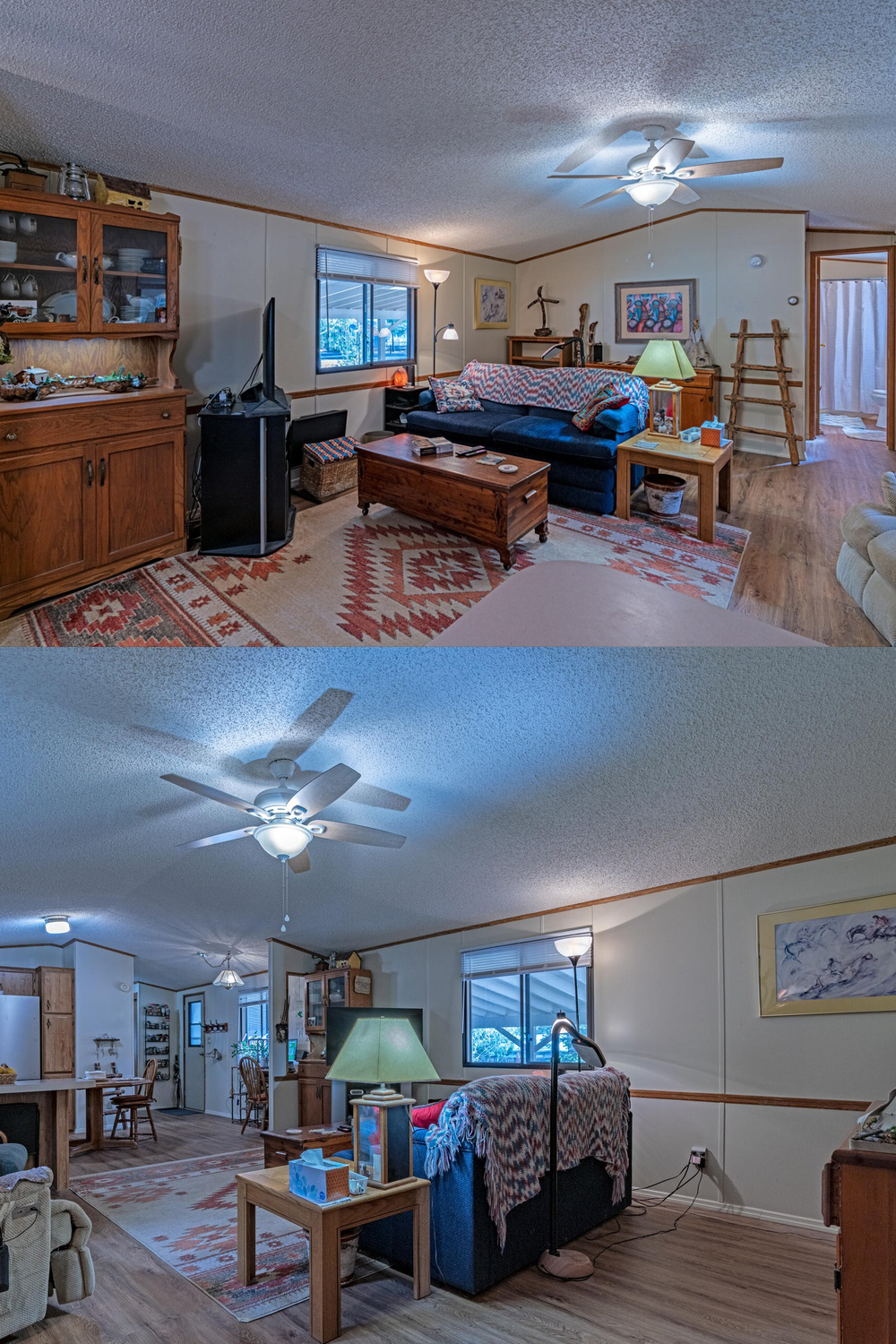 Walk into the living room and you’ll notice how inviting everything feels. The ceiling fan whirs gently overhead, spreading soft light through the space. Plush recliners and a deep blue sofa are arranged for easy conversation, movie nights, or lazy afternoons. A large patterned area rug grounds the room, adding both color and a touch of southwestern flair.